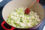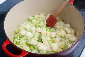 Add the chopped potatoes and make sure they get well covered with the leeks and butter. Cook gently for a further 10mins, making sure not to brown the leeks.