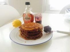 Pour about two tablespoons of mixture into the hot frying pan…wait a minute (you could add in some blueberries before you flip them) then flip it. I had mine with maple syrup, but lemon and sugar also amazing and I had made some home made blackcurrent jam to use up too, which took 10mins to make! Protein and fibre!
