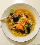 You can also use some heated bone broth and add this instead of water to the miso paste. No salmon? Use smoked mackerel or some veggie burgers like the Biona do great vegan burgers.